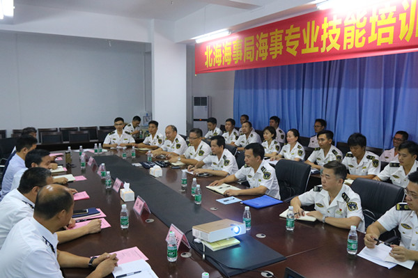座谈会后,双方举行了北海海事局海事专业技能培训开班仪式,北海局共抽调20余人参加本次培训。张懿主持了开班仪式,潘新祥校长发表了热情洋溢的致辞,江一斌致辞表示感谢广东海洋大学为北海海事局提供了一次很好的学习机会,并强调了本次专业技能培训班的重要性,希望借此机会开展北海海事局与广东海洋大学之间的多方位互动与合作。