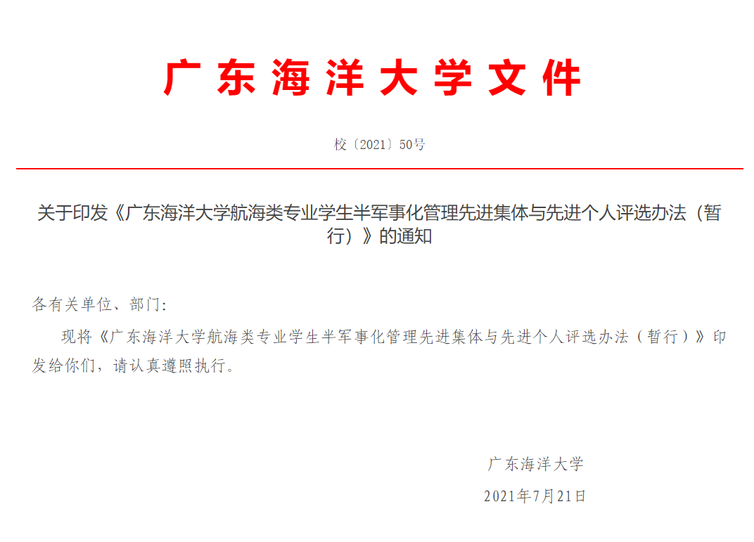 为做好航海类专业学生半军事化管理评优工作,充分发挥半军事化管理先进典型的模范带头作用,激励学生积极进取,创先争优,全面提升半军事化管理整体工作水平,依据《广东海洋大学航海类专业学生半军事化管理实施办法(试行)》(校〔2019〕40号)、《广东海洋大学学生先进集体与先进个人评定办法》(校学生〔2019〕53号)等有关规定,特制定本办法。