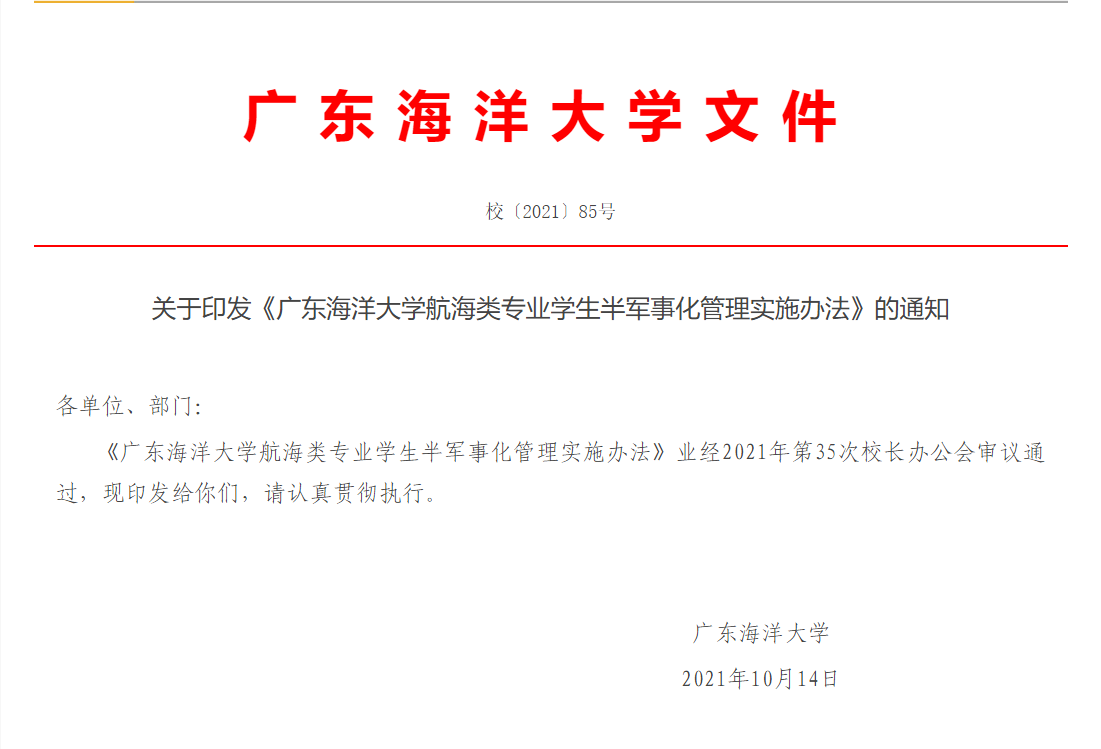 关于印发《广东海洋大学航海类专业学生半军事化管理实施办法》的通知