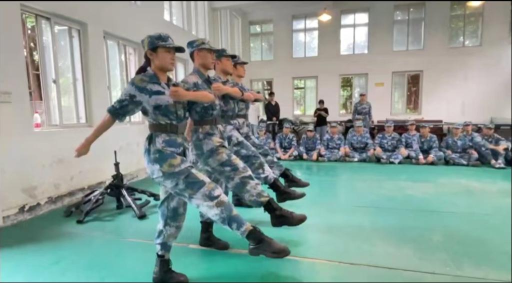 退伍复学的胡英康同学对 95式自动步枪的性能和结构进行了详细的讲解,并为同学们示范了“刺杀操”,通过讲解示范、组织训练,让同学们基本掌握了刺杀操的动作要领。