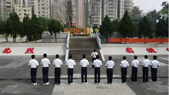 苍松滴翠、清风轻拂,坐落于湛江市霞山区的菉塘革命烈士纪念碑庄严肃穆。上午十时整,活动拉开帷幕。首先由龚嘉烨同学为大家讲述菉塘人民革命历史,随后所有同学献花默哀,深切缅怀为保家卫国而英勇牺牲的革命烈士,并在革命烈士纪念碑前重温入团誓词。