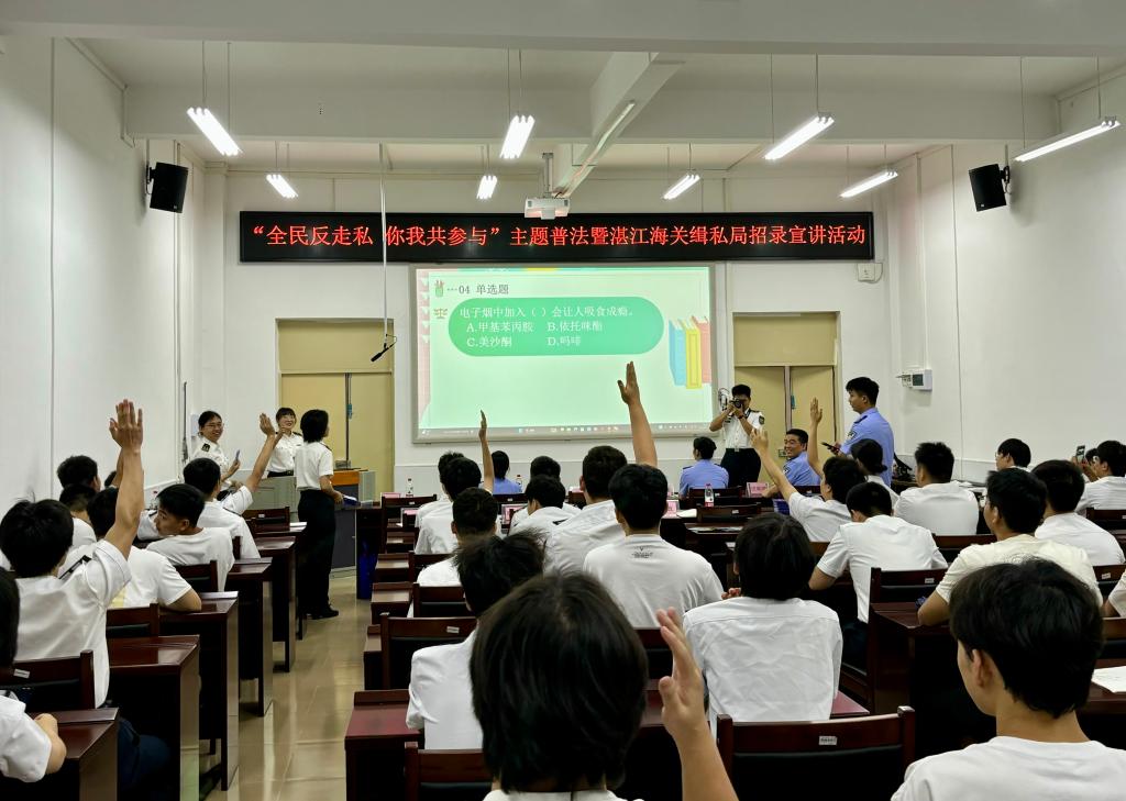 联合湛江海关缉私局、湛江海关风控分局在海滨校区举办了“全民反走私,你我共参与”主题普法暨湛江海关缉私局招录宣讲活动。学院正处级辅导员、党委副书记齐昊,湛江海关缉私局警务督察处二科科长曹雅琦,湛江海关缉私局法制处二科科长陈凯诗,湛江海关风控分局非贸风险科副科长王于蓝,学院辅导员张佳宁以及80余名同学等参加了本次活动。
