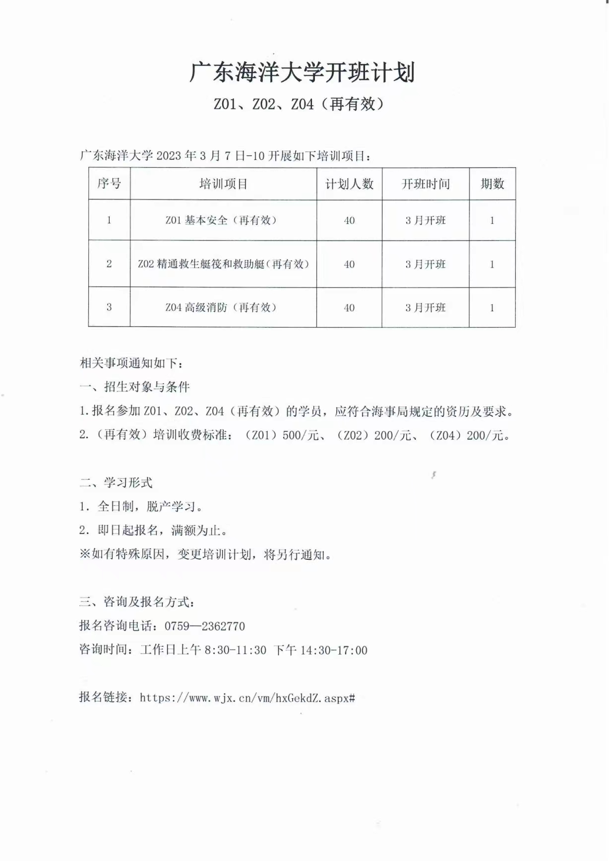 广东海洋大学船员培训开班计划(Z01、Z02、Z04再有效)