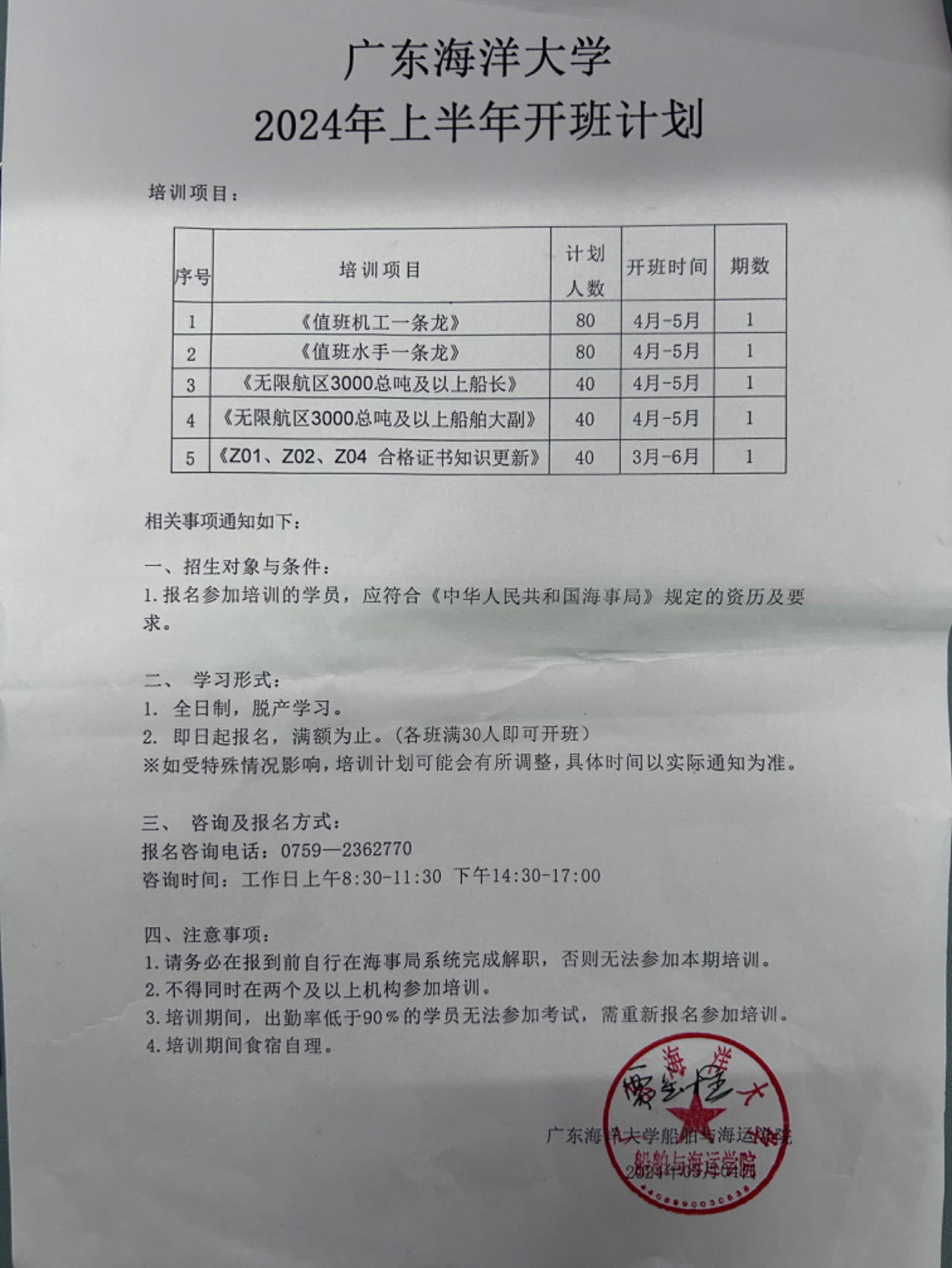 广东海洋大学2024年上半年开班计划