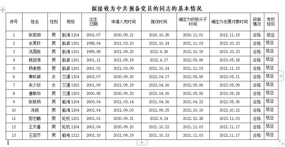 根据《广东海洋大学发展党员工作实施细则》规定,经本人提出申请,党组织培养考察,支委会审查研究决定,经学院党委预审通过,拟接收冼国良等13名同志为中共预备党员。现将有关情况予以公示,征求党员、群众意见。