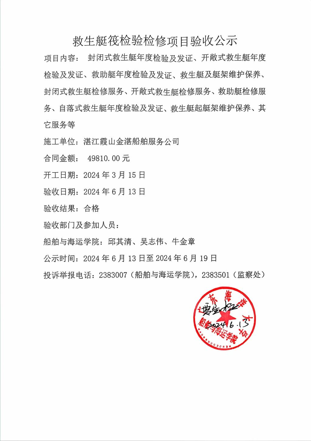 救生艇筏检验检修项目验收公示