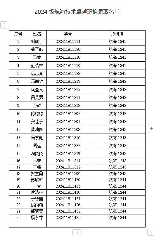 在选拔过程中,坚持“公开、公平、公正”及“学生自愿、控制规模、择优遴选”的原则,确保信息公开、流程规范和生源选拔质量。重点考察了平均绩点、班级排名、是否挂科、英语考试成绩和专业发展潜质等方面,最终确定刘朝宇等25位同学入选“2024级航海技术卓越班”。如有任何疑问请联系航海技术专业负责人:王立军。