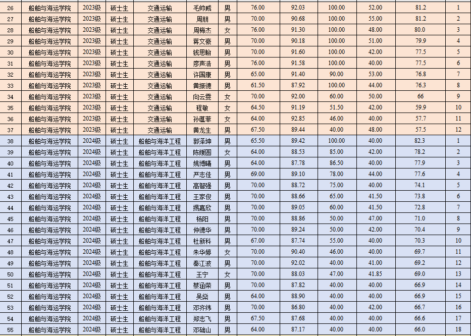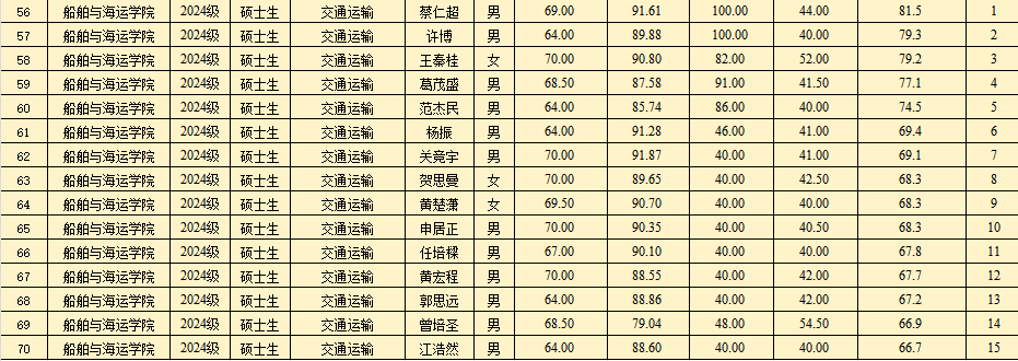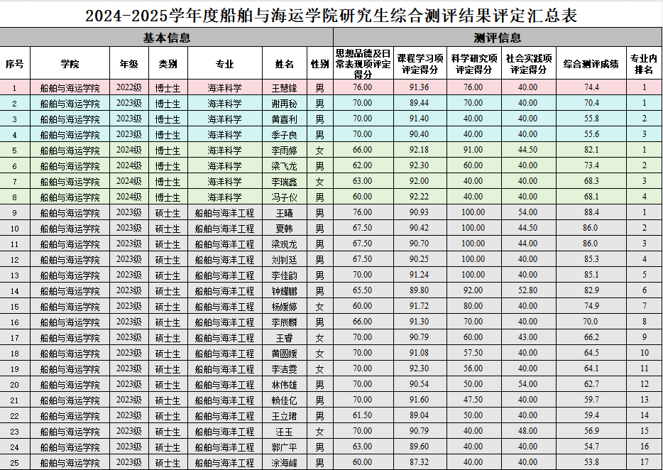 2024-2025学年度研究生综合测评结果公示如下: