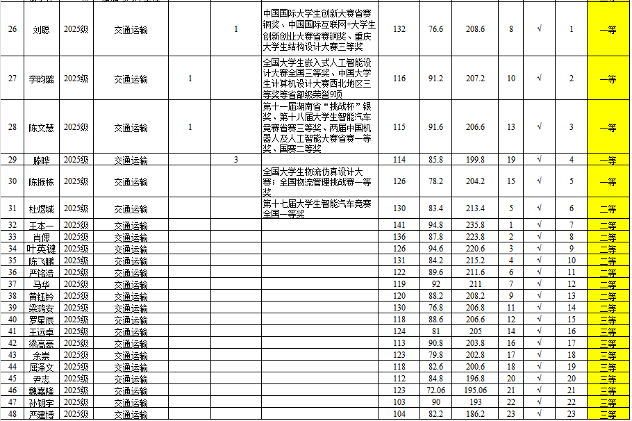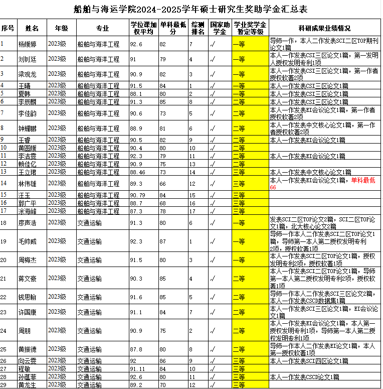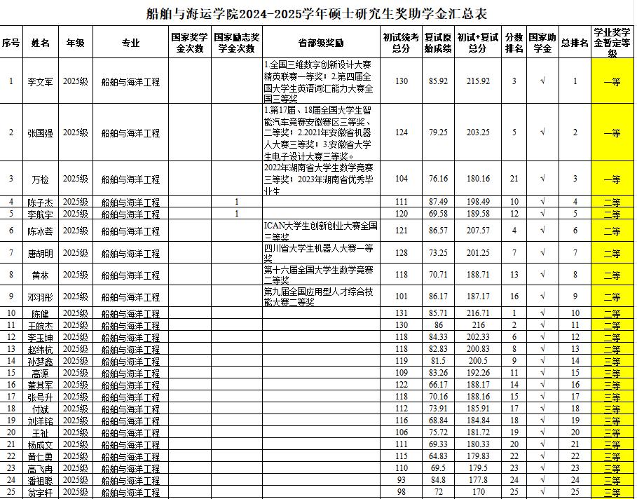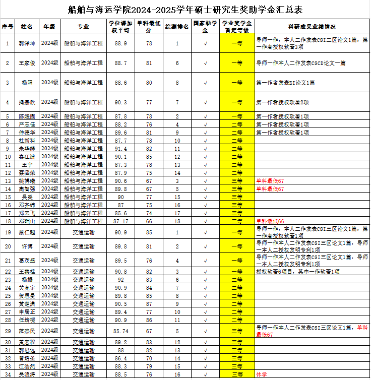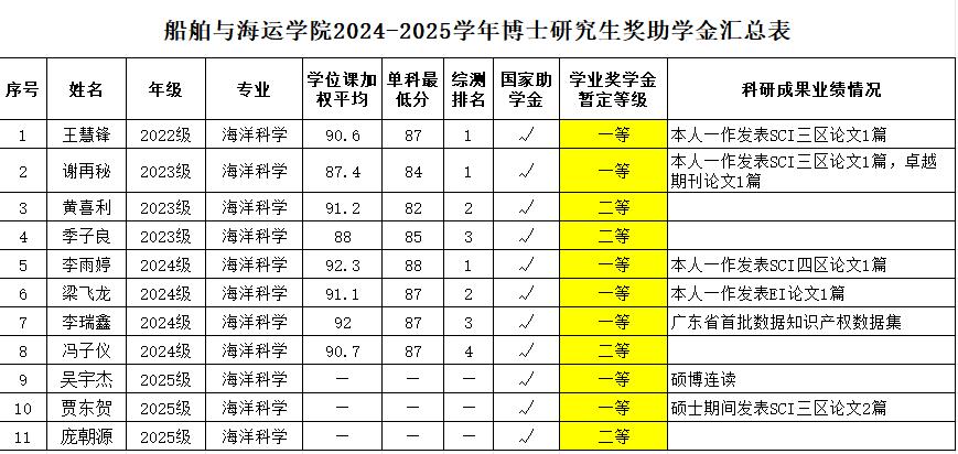 根据《广东省教育厅关于做好2025年秋季学期学生资助工作的通知》及《关于做好2025学年全日制研究生素质综合测评及奖助学金评审工作的通知》(校学生〔2025〕37号)的要求,按照《广东海洋大学全日制研究生奖助学金实施办法》(校研究生〔2021〕34号)执行,经个人申请、班级复审、学院评审小组认真审核及严格评选,拟确定获得研究生助学金、学业奖学金人员名单。其中,2023级交通运输专业吴浪涛同学因休学,其奖助学金待复学后予以补发。现将评审结果进行公示(详见附表)。