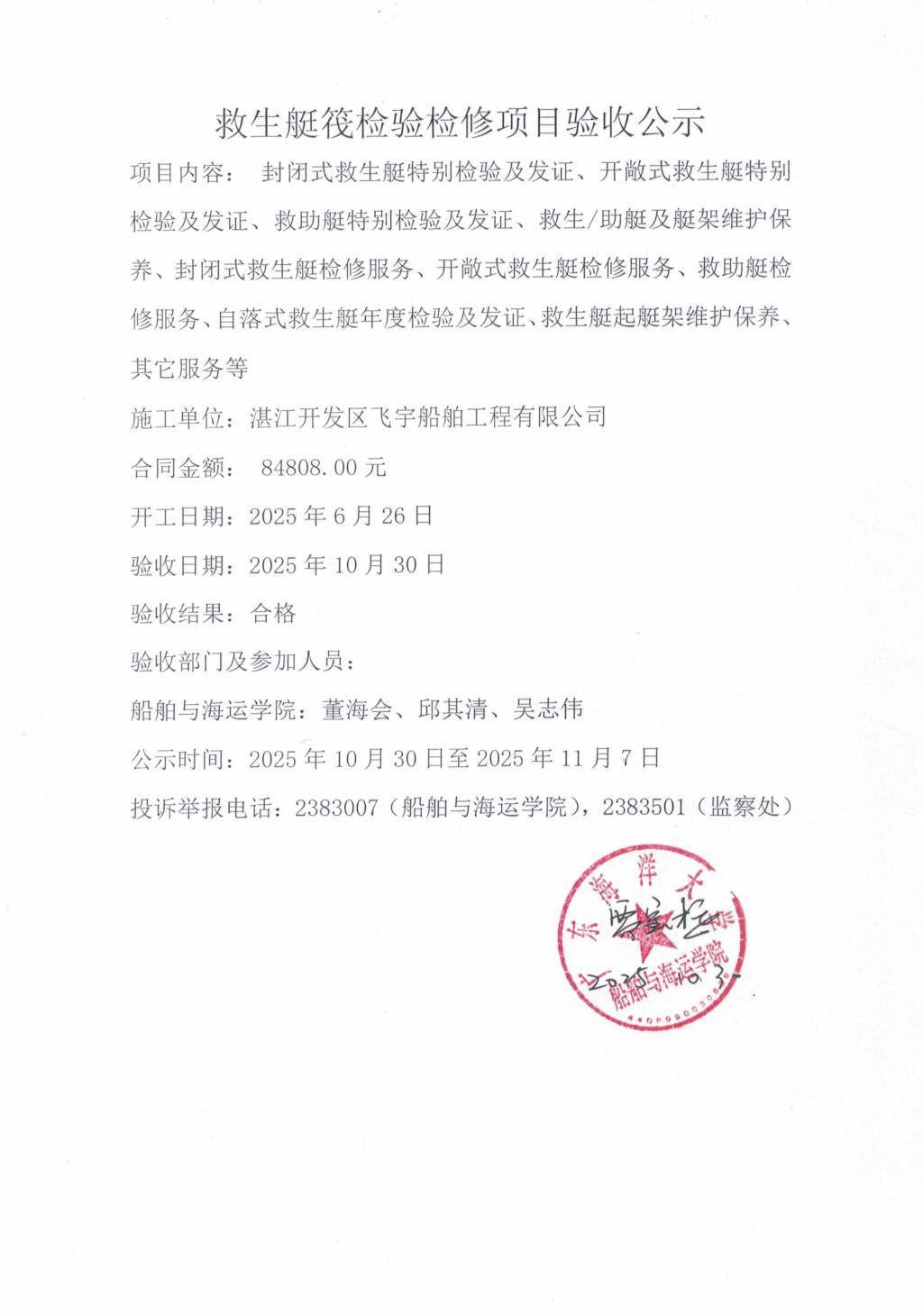 救生艇筏检验检修项目验收公示