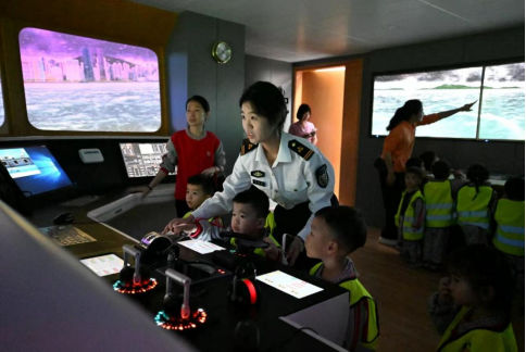 之后,小朋友们来到航海模拟器前,志愿者耐心地向他们介绍操作台上按钮和仪表盘的作用,以及如何模拟航海。小朋友们听得入神,迫不及待地想要尝试。在志愿者的帮助下,小朋友们坐在操作台前,好奇地操控着模拟器,感受船舶的乐趣,现场气氛十分活跃。