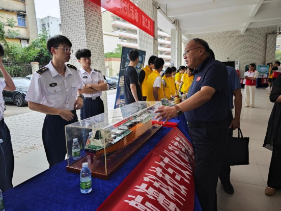 活动现场,第一批到访领导在志愿者的专业讲解下,深入了解广东海洋大学航海科技与文化科普教育基地。领导们对基地创新科普形式、传播航海文化的实践给予高度肯定。