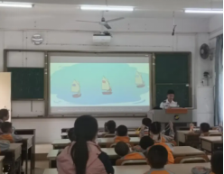 教室窗帘拉上,投影幕布亮起《航海小纵队》的精彩画面,帆船乘风破浪、集装箱船穿梭大桥、潜水艇探索深海,孩子们立刻坐直身子,眼睛紧紧追着屏幕。“帆船靠风前进!”“货船运好多东西!” 大家忍不住和小伙伴分享发现,播放间隙,讲解员抛出的趣味问题引发抢答热潮,奶声奶气的回答逗得全场欢笑,航海知识在轻松氛围中悄悄扎根。