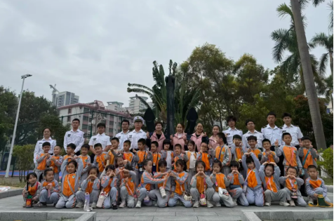 基地广场上,黝黑厚重的船锚雕塑刚映入眼帘,就引来孩子们阵阵惊呼:“哇!这个铁钩子比我还高!” 大家争先恐后围拢过来,小手触摸着冰凉粗糙的钢铁纹路,踮脚打量锚爪的奇特形状。讲解员蹲下身用童趣语言科普:“这是大船的‘超级安全带’,锚爪像有力的大手,能牢牢抓住海底泥沙,就算上万吨巨轮也能稳稳固定!” 孩子们听得目不转睛,纷纷举手追问 “怎么扔到海里”“怎么拉上来”,讲解员用手势模拟下放、抓取、回收的过程,生动演示让知识点瞬间变得易懂,清脆的笑声在雕塑旁久久回荡。