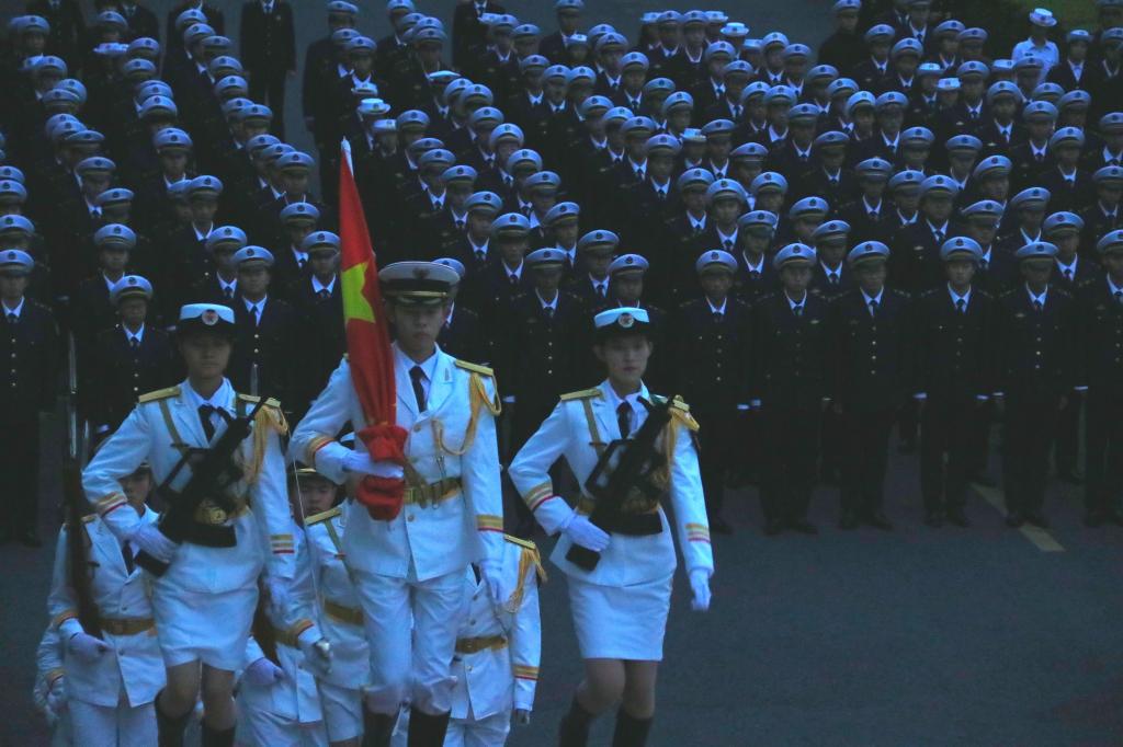 上午点,升旗仪式正式开始。海滨校区国旗护卫队的同学们身着笔挺的制服,脚踏坚定的步伐,护送着五星红旗庄严步入升旗台前。他们动作整齐划一,步伐铿锵有力,展现出半军事化管理下学生们严格的纪律性和良好的精神貌。随着国旗的缓缓升起,全体师生面向国旗,齐唱国歌行注目礼,心中激荡着对祖国的无限热爱与忠诚。随后,吴捍泽宣读了广东省教育厅与广东省军区战备建设局联合表扬信,表扬信充分肯定我院师生在2024广东省学生军事训练营和第九届全国学生军事训练营训练营中付出的努力,展现顽强拼搏、自强不息的精神风貌。