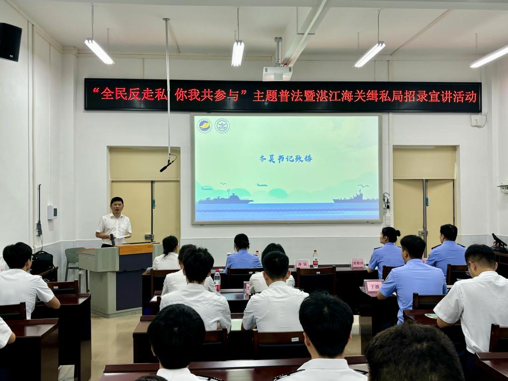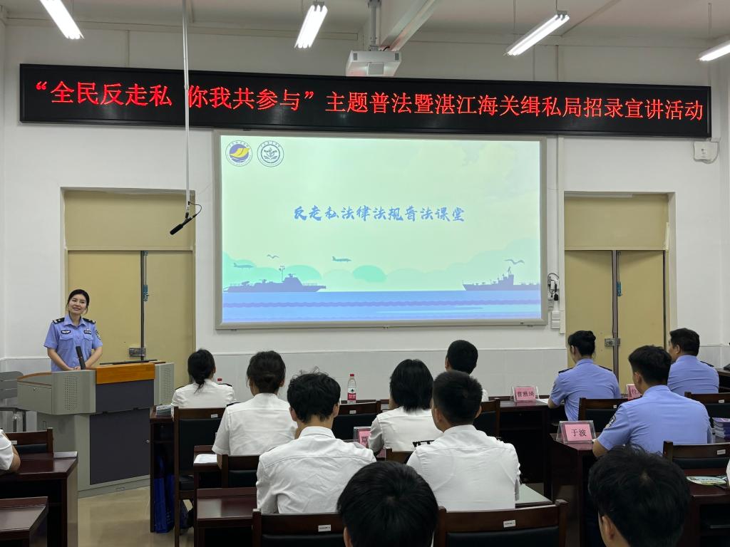 联合湛江海关缉私局、湛江海关风控分局在海滨校区举办了“全民反走私,你我共参与”主题普法暨湛江海关缉私局招录宣讲活动。学院正处级辅导员、党委副书记齐昊,湛江海关缉私局警务督察处二科科长曹雅琦,湛江海关缉私局法制处二科科长陈凯诗,湛江海关风控分局非贸风险科副科长王于蓝,学院辅导员张佳宁以及80余名同学等参加了本次活动。