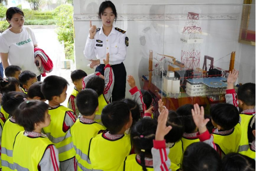 的船锚旁,这个巨大的船锚立刻吸引了他们的目光。现场的志愿者亲切地给小朋友们讲起船锚的故事,从锚杆、锚爪等部件,用简单有趣的话语,让小朋友们理解船锚的构造。志愿者还通过提问、互动的方式,引导小朋友们思考,小朋友们纷纷踊跃举手,回答志愿者的问题,对回答的小朋友给予糖的奖励。