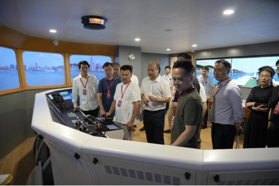 在轮机模拟实验室,贾院长逐一介绍了模拟设备的功能及应用场景,从轮机系统仿真运行到故障诊断实训,全方位展示了学院在实践教学中的创新举措。