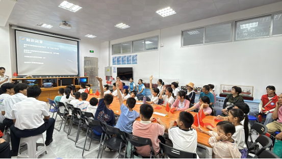 第三站,同学们来到了基地会议室,一场精彩的航海文化科普课堂在这里拉开帷幕。志愿者们以郑和下西洋这一伟大壮举为切入点,带领大家穿越历史的长河,领略波澜壮阔的航海史。从古代的帆船到现代的巨轮,从航海技术的演变到航海文化的传承,每一个故事都让同学们听得如痴如醉。课堂最后,志愿者讲述了广东海洋大学优秀校友陈宏泽先生的先进事迹,鼓励小朋友们以这些优秀榜样为标杆,努力学习,不断提升自己,将来成为对国家和社会有用的人才。